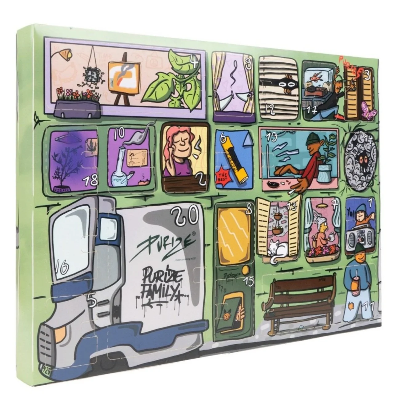 Auszüge meiner illustrativen Arbeiten für Purize.Der 420 Adventskalender mit 20 getsalteten Türchen und der Growrilla Sticker für die Tiersticker Reihe von Purize. Purize